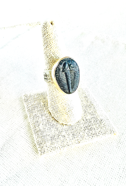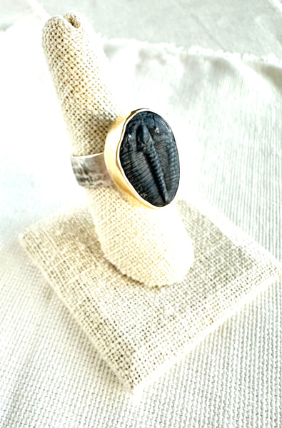 An artisan crafted signet ring featuring a Trilobite Fossil. Set in a textured silver band with a yellow 14kt gold bezel, the ring showcases an exquisitely detailed trilobite fossil, a captivating piece for those who appreciate natural history and distinctive design.