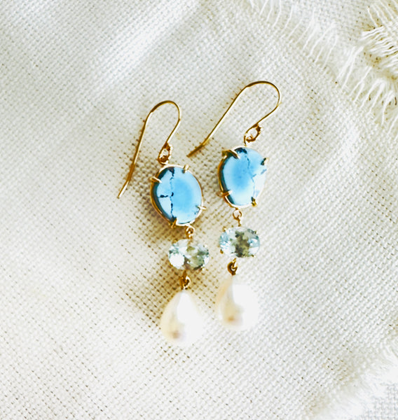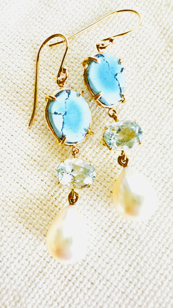 Enhance your style with these charming Kazakhstan Turquoise and Brazilian Aquamarine 14 karat yellow gold drop earrings. Each earring features a lustrous pear-shaped pearl suspended below a faceted Brazilian Aquamarine, creating a delightful contrast. These earrings combine classic elegance with a touch of whimsy.