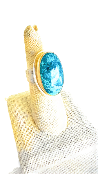 Elevate your style with this stunning yellow gold cocktail ring. Showcasing a captivating oval cabochon Chrysocolla gemstone, this ring exhibits a soothing bluish green hue set in a 14kt gold bezel with vintage style sterling silver band. The opaque gemstone is securely set, making it a standout piece for any occasion.